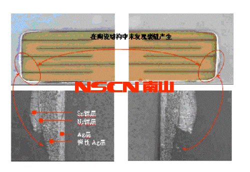 柔性端頭SuperTerm系列產(chǎn)品在板彎測(cè)試中產(chǎn)生破壞時(shí),其破壞模式是開路模式,而。一般端電極開路或短路模式都會(huì)產(chǎn)生。柔性端頭SuperTerm系列中的彈性層可從剖面圖中看見,其成份中含有〝高分子銀〞以產(chǎn)生此彈性效果。