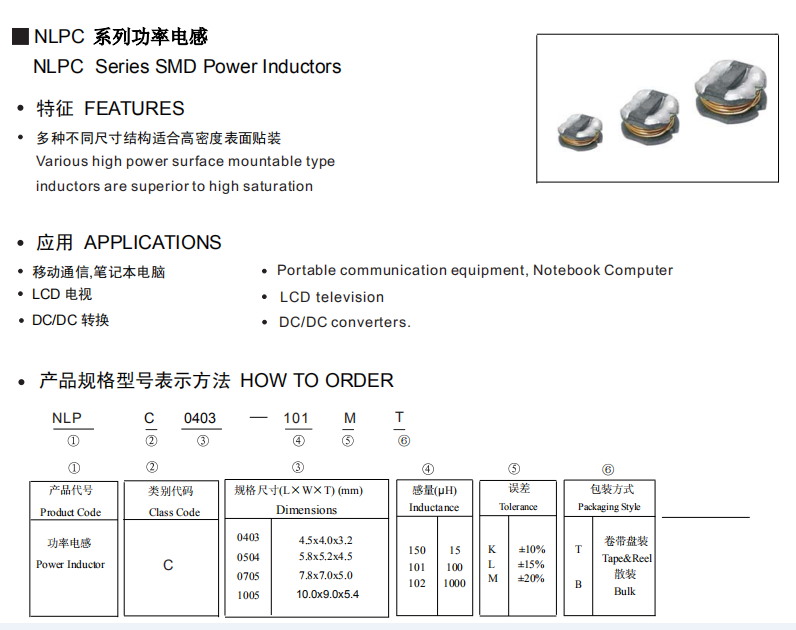 今天來介紹下功率電感,那么功率電感與普通電感到底有哪些區(qū)別呢?首先,其實(shí)任何電感通電時(shí)都有一定的功率,此功率一般是是無功功率,如果電感中通過的電流要比導(dǎo)線的飽和電流小很多,一般不稱之為“功率電感”。所謂功率電感,一般指那些電流較大的電感,除了電感量之外,還要考慮通過電流大小。當(dāng)然如果電感的電流較大,而電壓也很高,就是功率電感了。那么貼片功率電感功率電感又有哪些區(qū)別呢?功率電感其實(shí)是一個(gè)籠統(tǒng)的說法,功率電感一般分為貼片功率電感和直插功率電感。貼片功率電感也可以稱為繞線電感,而直插功率電感一般具有燕高效率及高飽和電流。一般應(yīng)用在打印機(jī),液晶電視,復(fù)印機(jī)上。南山電子主要與風(fēng)華高科合作,代理風(fēng)華的功率電感,一般有以下幾個(gè)系列:MS功率電感,PIO功率電感,PRS功率電感,HA功率電感等,除了風(fēng)華高科品牌,NLP功率電感是南山電子自主品牌產(chǎn)品線之一。目前NLP功率電感主要推出NLPC系列、NLPF系列、NLPE系列、NLPM系列、NLPP系列、NLPH系列等主要六個(gè)系列功率電感產(chǎn)品。型號(hào)規(guī)格可以替代風(fēng)華高科相關(guān)系列功率電感,在這里選擇其中一個(gè)NLPC系列功率電感規(guī)格書如下: