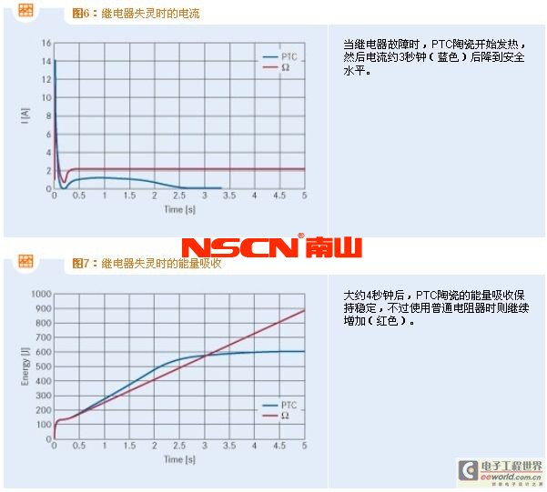 當(dāng) 發(fā)生故障時(shí),PTC熱敏電阻用作限流元件的優(yōu)勢(shì)就會(huì)十分明顯。如果繼電器接通失敗,負(fù)荷電流將流經(jīng)充電電阻器,并產(chǎn)生強(qiáng)大的熱應(yīng)力,這要求電阻器有相應(yīng)的 尺寸。若采用基于PTC陶瓷的充電電阻器,其電阻會(huì)由于強(qiáng)大的起始功率損耗而升至數(shù)10 k,從而能夠在故障發(fā)生期間限定電流(參見(jiàn)圖6)。在約三秒之后,先流經(jīng)兩電阻器然后流經(jīng)總體電路的電流已跌至數(shù)10 mA。有關(guān)吸取能量的比較,請(qǐng)參見(jiàn)圖7。