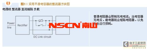 強(qiáng)大的沖擊電流在約150 ms之后使兩個(gè)自我防護(hù)式充電電阻器產(chǎn)生高電阻性,進(jìn)而限制電流。而流經(jīng)固定電阻器的電流則僅由極低的電源線電阻進(jìn)行限定,因此固定電阻器中會(huì)產(chǎn)生非常高功率的能量轉(zhuǎn)換。