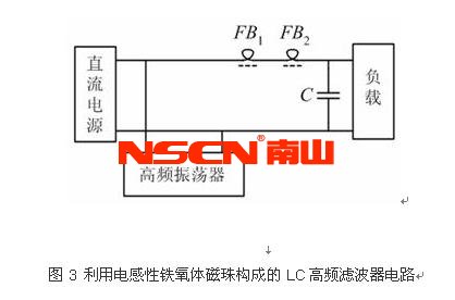 由于鐵氧體磁珠在電路中使用能夠增加高頻損耗而又不引入直流損耗,而且體積小、便于安裝在區(qū)間的引線或者導(dǎo)線上,對(duì)于1MHz以上的噪 聲信號(hào)抑制效果十分明顯,因此可用作高頻電路的去耦、濾波以及寄生振蕩的抑制等。特別對(duì)消除電路內(nèi)部由開(kāi)關(guān)器件引起的電流突變和濾波電源線或其它導(dǎo)線引入 電路的高頻噪聲干擾效果明顯。低阻抗的供電回路、諧振電路、丙類(lèi)功率放大器以及可控硅開(kāi)關(guān)電路等,使用鐵氧體磁珠進(jìn)行濾波都是十分有效的。鐵氧體磁珠一般 可以分為電阻性和電感性?xún)深?lèi),使用時(shí)可以根據(jù)需要選取。單個(gè)磁珠的阻抗一般為十至幾百歐姆,應(yīng)用時(shí)如果一個(gè)衰減量不夠時(shí)可以用多個(gè)磁珠串聯(lián)使用,但是通常 三個(gè)以上時(shí)效果就不會(huì)再明顯增加了[7]。如圖3示出了利用兩只電感性鐵氧體磁珠構(gòu)成的高頻LC濾波器電路,該電路可有效的吸收由高頻振蕩器產(chǎn)生的振蕩信 號(hào)而不致竄入負(fù)載,并且不降低負(fù)載上的直流電壓。