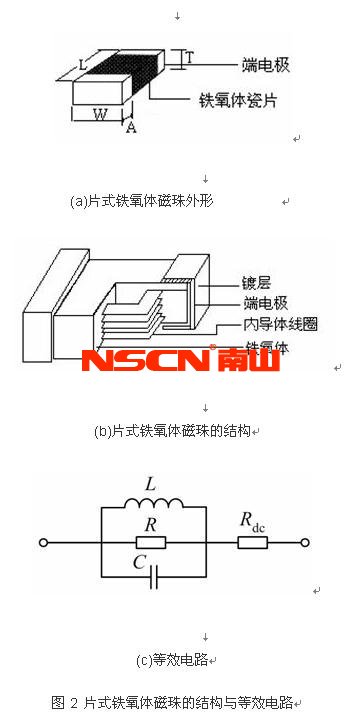 片式磁珠是目前應(yīng)用、發(fā)展很快的一種抗干擾元件,廉價(jià)、易用,濾除高頻噪聲效果顯著。片式磁珠由軟磁鐵氧體材料組成,片式鐵氧體磁珠的 結(jié)構(gòu)和等效電路如圖2所示,實(shí)質(zhì)上它就是1個(gè)疊層型片式電感器,是由鐵氧體磁性材料與導(dǎo)體線圈組成的疊層型獨(dú)石結(jié)構(gòu)。由于在高溫下燒結(jié)而成,因而具有致密 性好、可靠性高等優(yōu)點(diǎn)。兩端的電極由銀/鎳/焊錫3層構(gòu)成,可滿(mǎn)足再流焊和波峰焊的要求。在圖2所示的等效電路中,R代表由于鐵氧體材料的損耗(主要是磁 損耗)以及導(dǎo)體線圈的歐盟損耗而引起的等效電阻,C是導(dǎo)體線圈的寄生電容。
