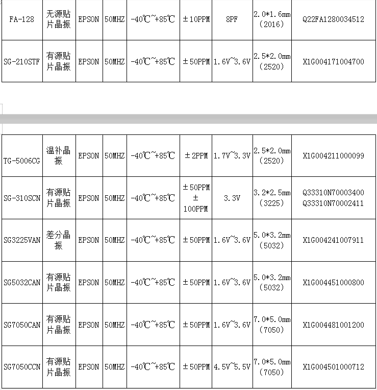 晶振50MHz也是應(yīng)用比較廣泛的一種頻率,其可以用于銀行金融系統(tǒng),稅控系統(tǒng),遠(yuǎn)程抄表系統(tǒng),加密狗,測(cè)試儀器,超聲頻,網(wǎng)絡(luò)傳輸ADSL,安防(攝像頭,報(bào)警器)等,其實(shí)常用的50MHz晶振大部分是50MHz有源晶振,比如50MHz溫補(bǔ)晶振——愛普生晶振TG5006CG 50.000000 MHz,南山半導(dǎo)體是愛普生晶振官方授權(quán)中國(guó)地區(qū)核心代理商,擁有國(guó)內(nèi)唯一一家愛普生授牌中國(guó)地區(qū)有源晶振燒錄中心,實(shí)現(xiàn)了小批量,快速交付的客戶需求。還是老規(guī)矩,我們深信客戶的體驗(yàn)度是首要標(biāo)準(zhǔn),在這里繼續(xù)整理常用愛普生晶振50MHz的晶振型號(hào)給大家選型參考: