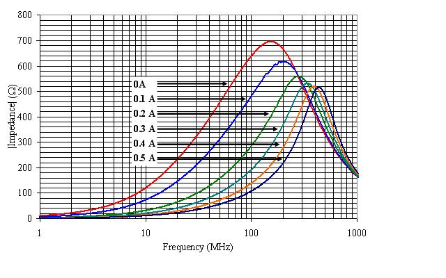 但大部分磁珠通常被放在電源線上用來濾除電源的EMI噪聲。而在有偏置電流的情況下,磁珠的特性會發(fā)生一些變化。下面是某個0805尺寸 額定電流500mA的磁珠在不同的偏置電流下的阻抗曲線。大家可以看到,隨著電流的增加,磁珠的峰值阻抗會變小,同時阻抗峰值點的頻率也會變高。
