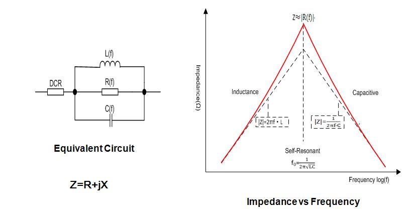 從等效電路中可以看到,當頻率低于fL(LC諧振頻率)時,磁珠呈現(xiàn)電感特性;當頻率等于fL時,磁珠是一個純電阻,此時磁珠的阻抗(impedance)最大;當頻率高于諧振頻率點fL時,磁珠則呈現(xiàn)電容特性。